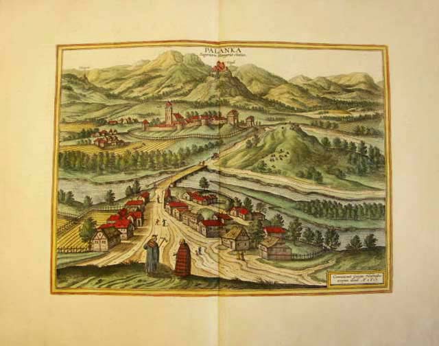 Size of map appr: 32,5 x 44,5 cm, Size of leaf appr:  49,5 x 59,5 cm.  Large decorative colored copper engraving view of “Palanka superioris Hungariae civitas.” after Georg Hoefnagel, Amsterdam, um 1650 A.D. aus “Theatrum Praecipuarum Urbium” [Janssonius Städtebuch]